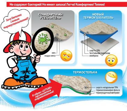 Инновационная обувь с новым термо утеплителем ШТОМ представляет собой зимнюю обувь с современным Инновационным утеплителем ШТОМ (натуральная овечья шерсть 70% на трикотажной основе с термо мембраной). На сегодняшний день инновационный подклад ШТОМ ШТОМ является 100% альтернативой меху. В своем составе он содержит 70% натуральной шерсти (это те же волокна натурального меха овчины) с добавлением небольшого количества антибактериальных нетоксичных волокон, сохраняющих основное тепло вокруг стопы и увеличивающих износостойкость подкладки. Также в состав утеплителя входит специальная термо мембрана, которая увеличивает термостойкость всей обуви.