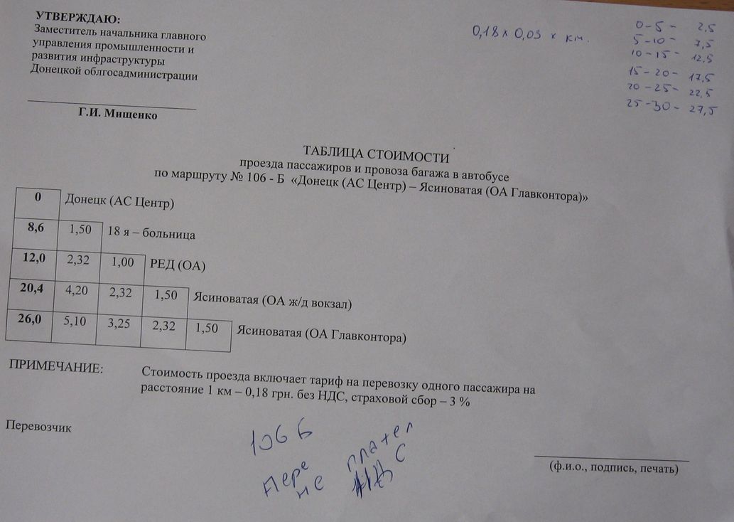 106 (крытый рынок): Ясиноватая главконтора- РЭД= 2,76 (0,18 грн/км +3%+20%)