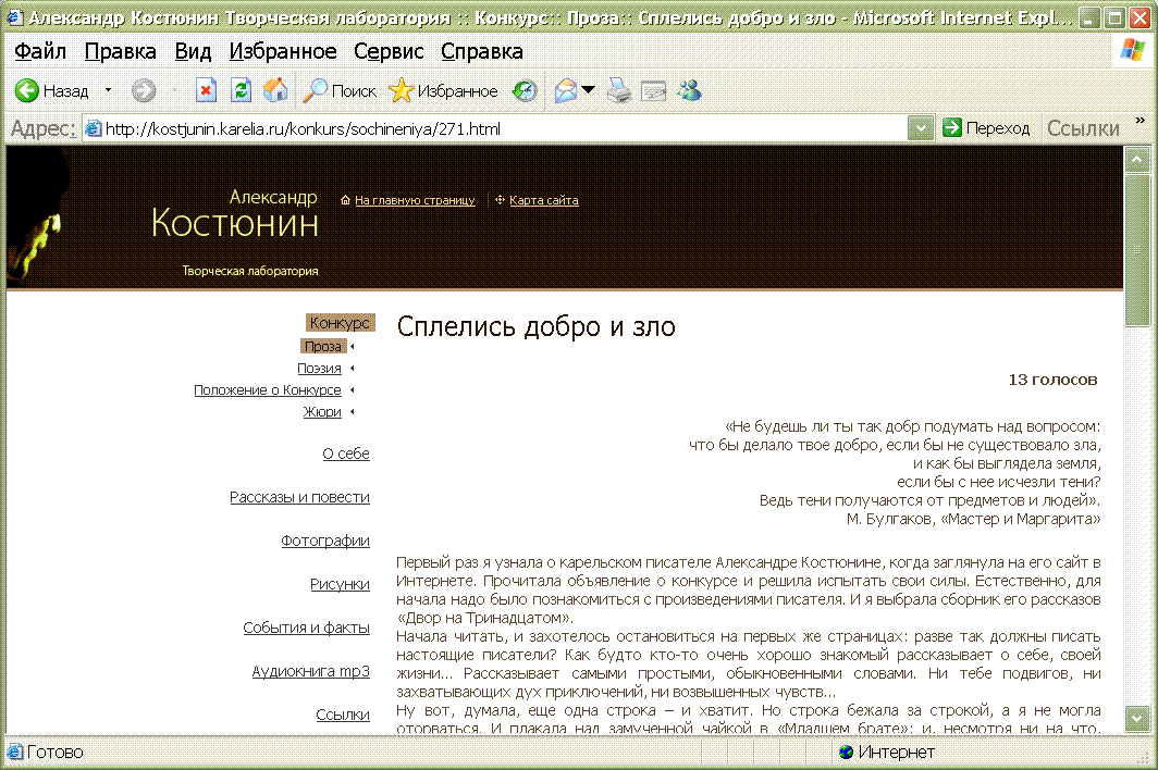 Здравствуйте все! :) Я - Настя , мне 15 лет, живу на Зорьке. Участвую в российском интернет-конкурсе сочинений. Чем больше людей проголосуют за мою работу, тем большие шансы на победу. Если вы захотите мне помочь, идите на сайт http://kostjunin.karelia.ru/konkurs/sochineniya.html, страница "Проза". Ищите № 271 - "Сплелись добро и зло". Прочитайте и нажмите кнопку "голосовать". Я очень старалась.